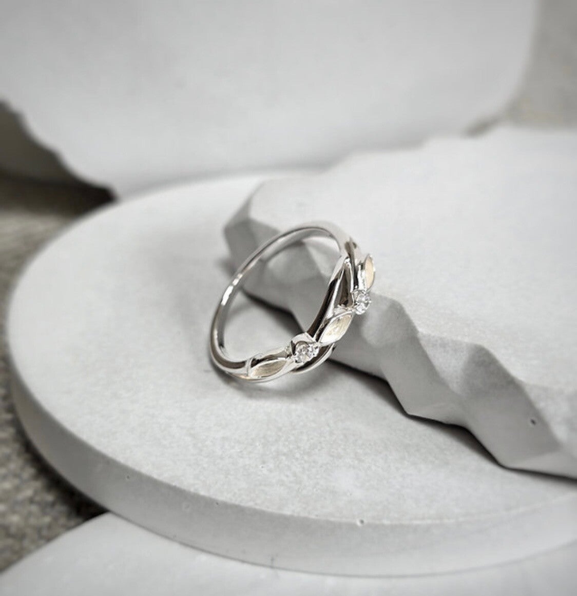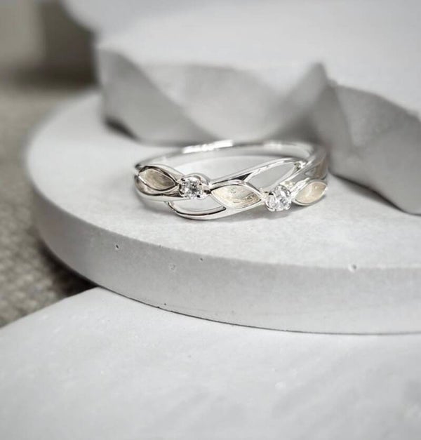 Sterling silver and cubic zirconia half eternity band with three separate setting chambers for resin and inclusions.