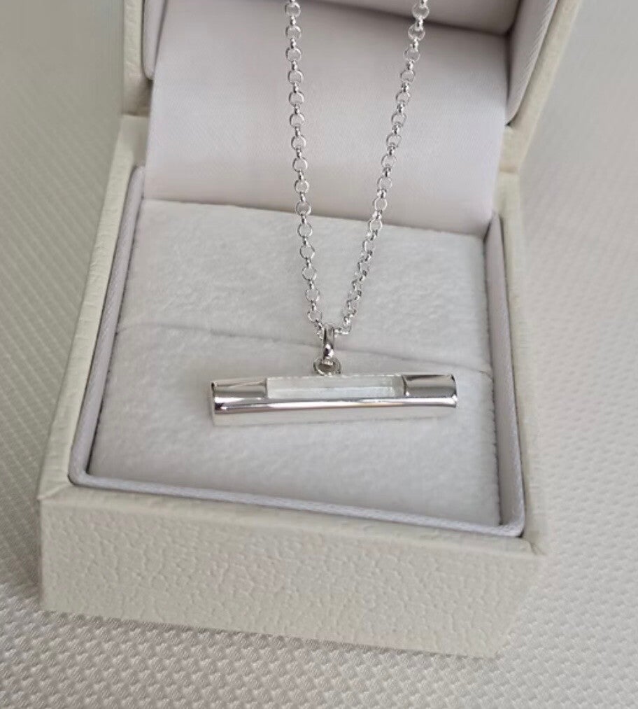 Sterling silver simple horizontal T-bar pendant with plenty of room for your inclusion, its understated style allows for a private and personal tribute.