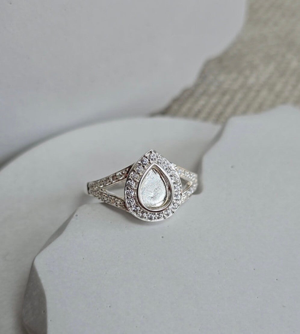 A sterling silver ring edged in CZ. Pear shaped with split shank shoulders. A truly beautiful ring.