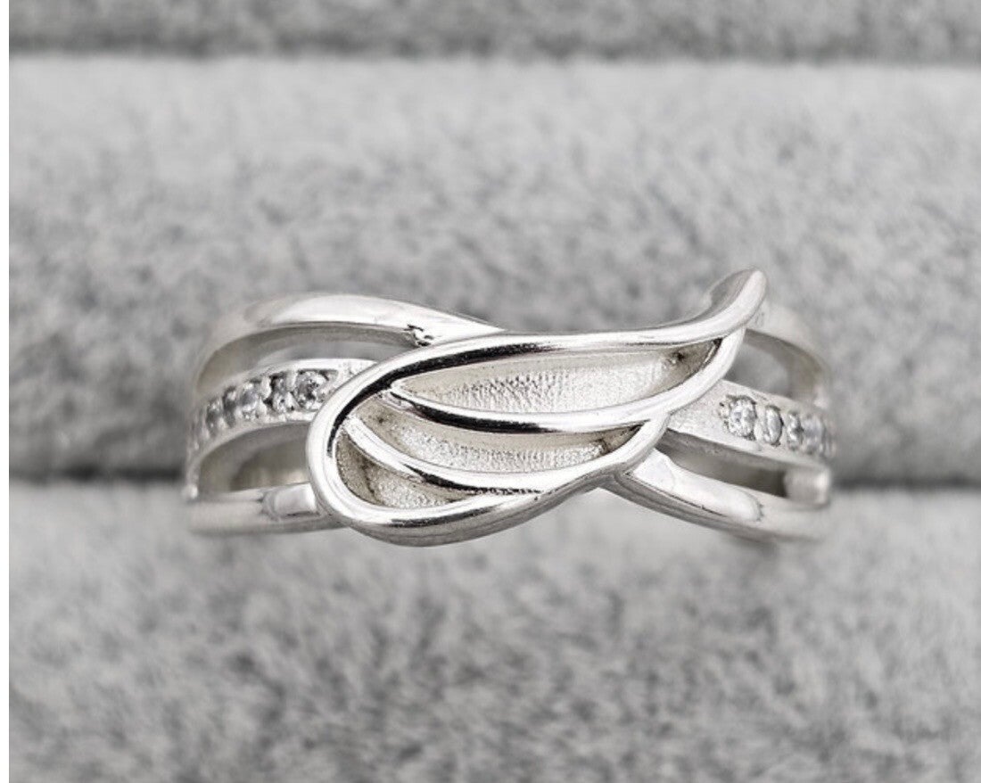 A 925 silver band with a wing bezel for inclusions. Its 3 band effect with a CZ set middle band make this a popular piece.