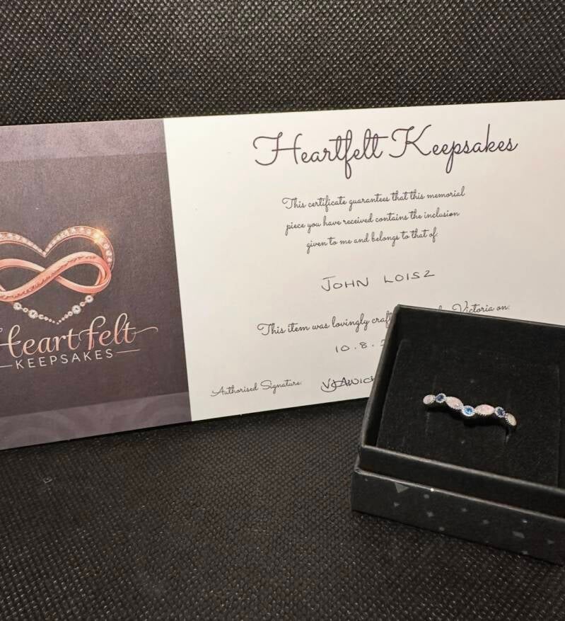 '' thank you from the bottom of our hearts for the beautiful ring you made for my mum, we have had others made by other companies but you kept us updated from beginning to end, that personal touch you give is extra special and made us feel that bit more comfortable when you're trusting someone with ashes of someone you love so much. Thank you so much for being so friendly and professional with what you do xx ''
