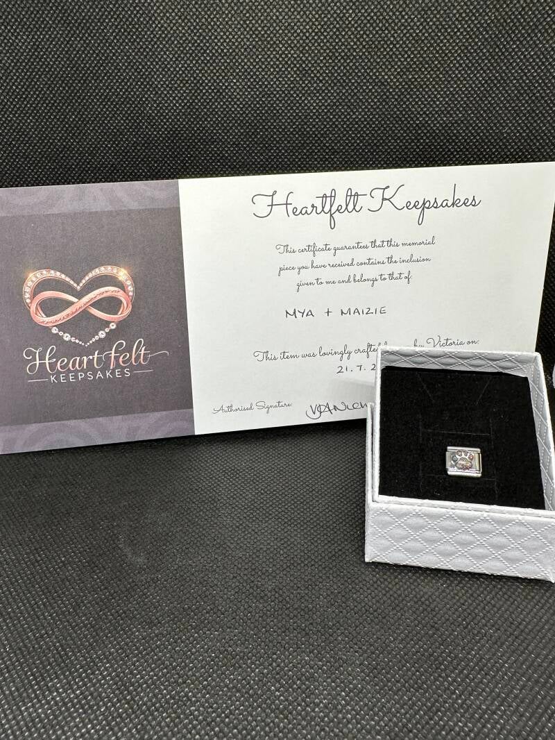 '' I purchased a matching pawprint charm and necklace from Heartfelt Keepsakes which incorporated ashes of both my fur babies. The service i received from start to finish was excellent, I was kept updated on my order and delivery was quick. The packaging was beautiful and a certificate was included which i thought was a lovely personal touch. I'm so pleased with the finished products and have had so many compliments from friends and family. Such beautiful keepsakes that I will cherish forever, thank you xxx ''